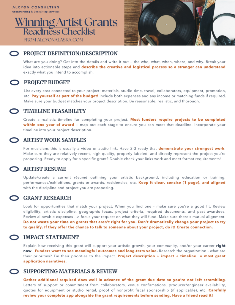 Many artists aren’t familiar with how to think of their artistic practice in the framework of a grant program. We’ve developed the checklist below to help you build a winning grant application.